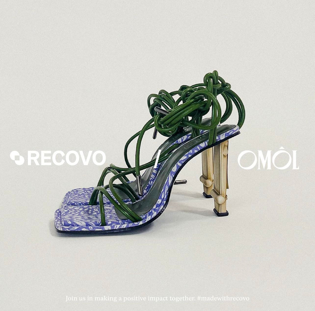 Created through a thoughtful collaboration between OMÔL and RECOVO, this design reimagines footwear by transforming reclaimed materials into an iconic statement piece, enhanced by a vibrant, woven print that brings freshness, movement, and individuality to its sculptural form.